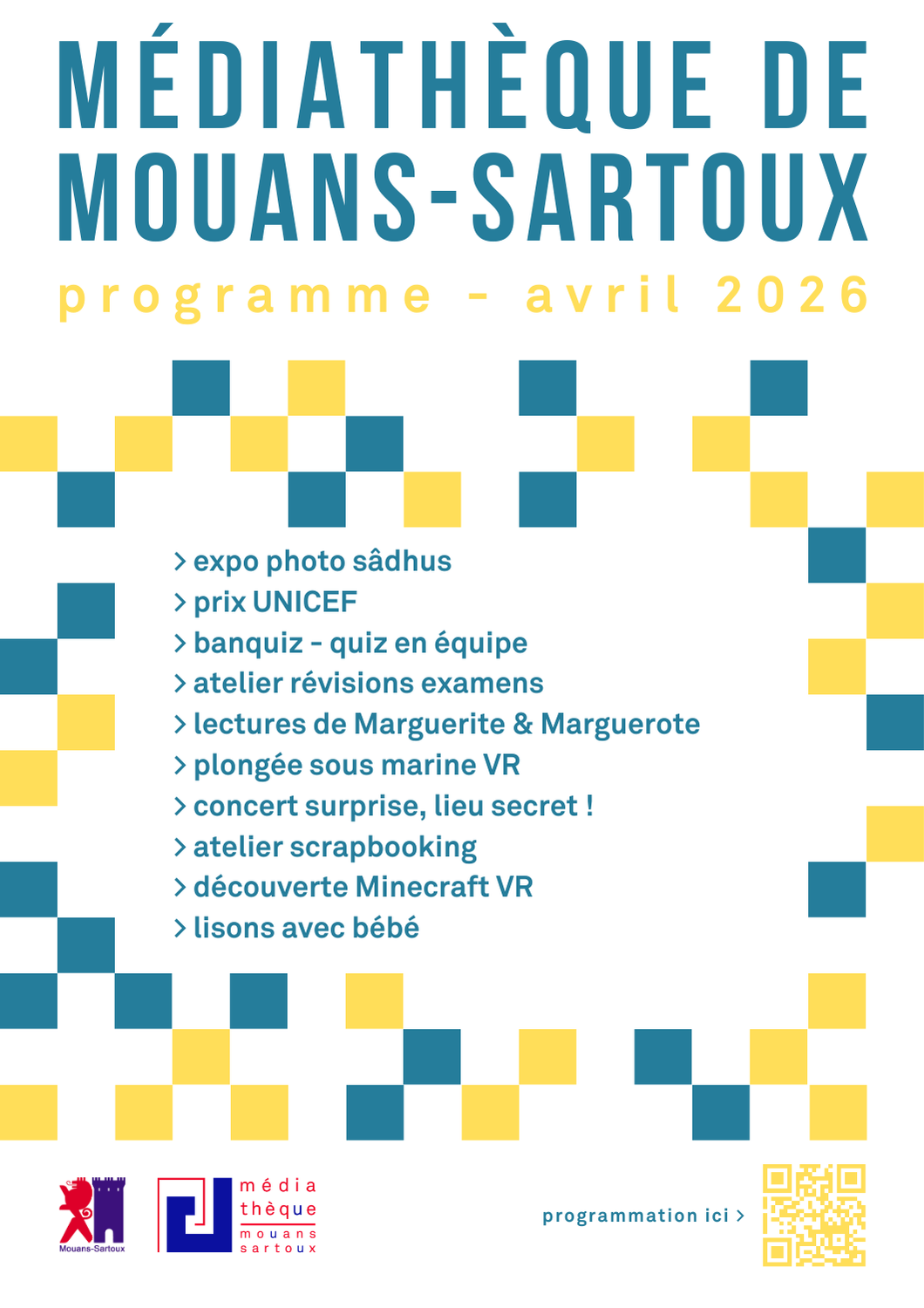 Un mois d'avril à la médiathèque Détails des prochaines sessions Du mercredi 01 avril 2026 à 10:00 au jeudi 30 avril 2026 à 18:00 Prochaines sessions