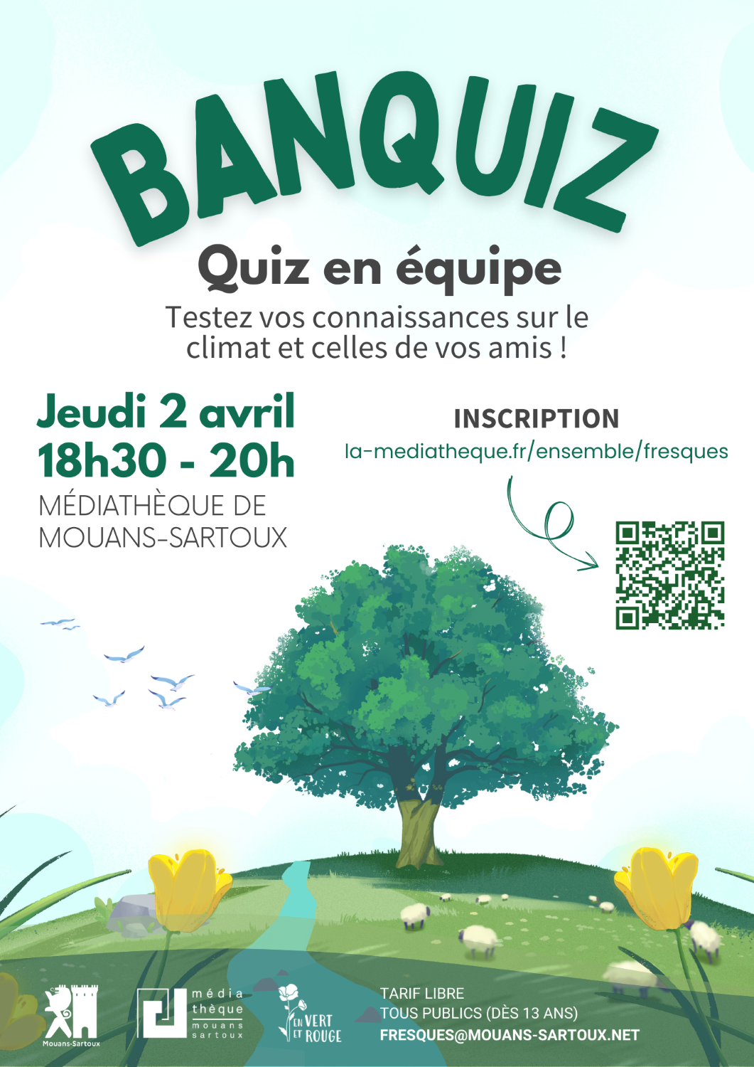 Participez à un quiz ludique et collaboratif pour mieux comprendre le changement climatique ! En équipe, échangez, débattez et trouvez ensemble les bonnes réponses. Un moment convivial pour apprendre en s’amusant, partager des idées et repartir avec une vision plus claire et positive des enjeux climatiques.